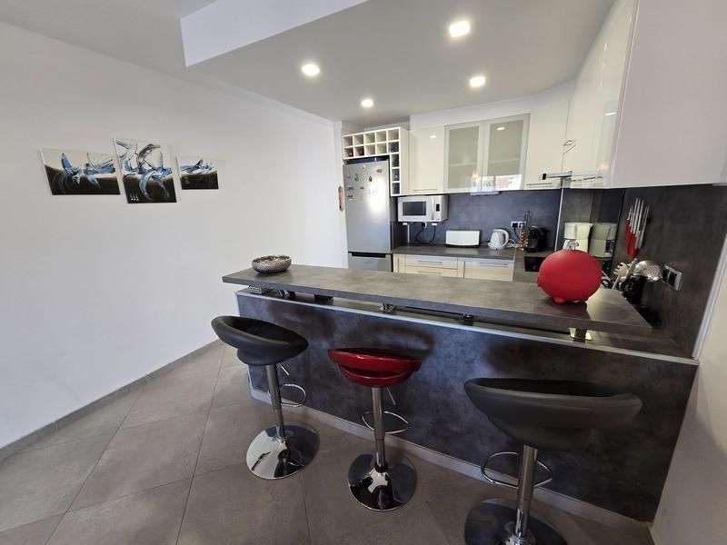 Cuina totalment equipada: frigorífic gran, forn, microones, placa de cocció de 4 focs, rentavaixelles, campana extractora i barra amb 3 tamborets alts.