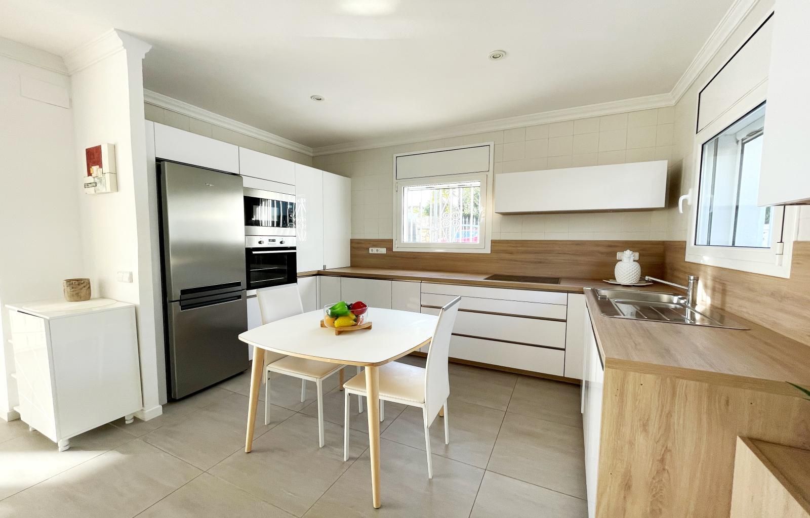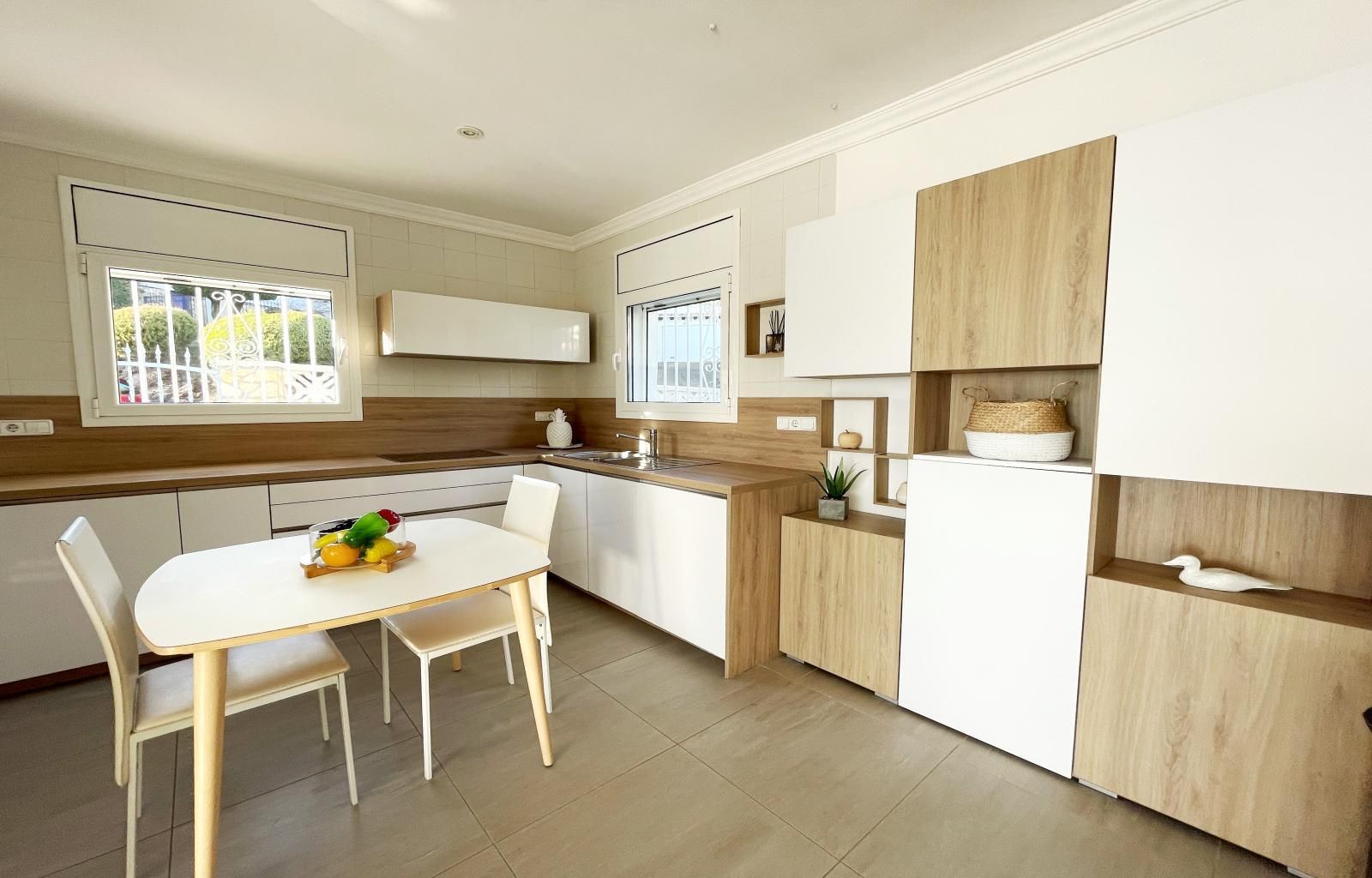 Con 120 m² de superficie construida distribuidos en una sola planta, esta propiedad destaca por su comodidad y su atmósfera acogedora. Desde la entrada principal, accedemos a un acogedor salón-comedor bañado por luz natural, conectado con una cocina abierta renovada en 2016, completamente equipada con lavavajillas, horno, microondas y frigorífico.