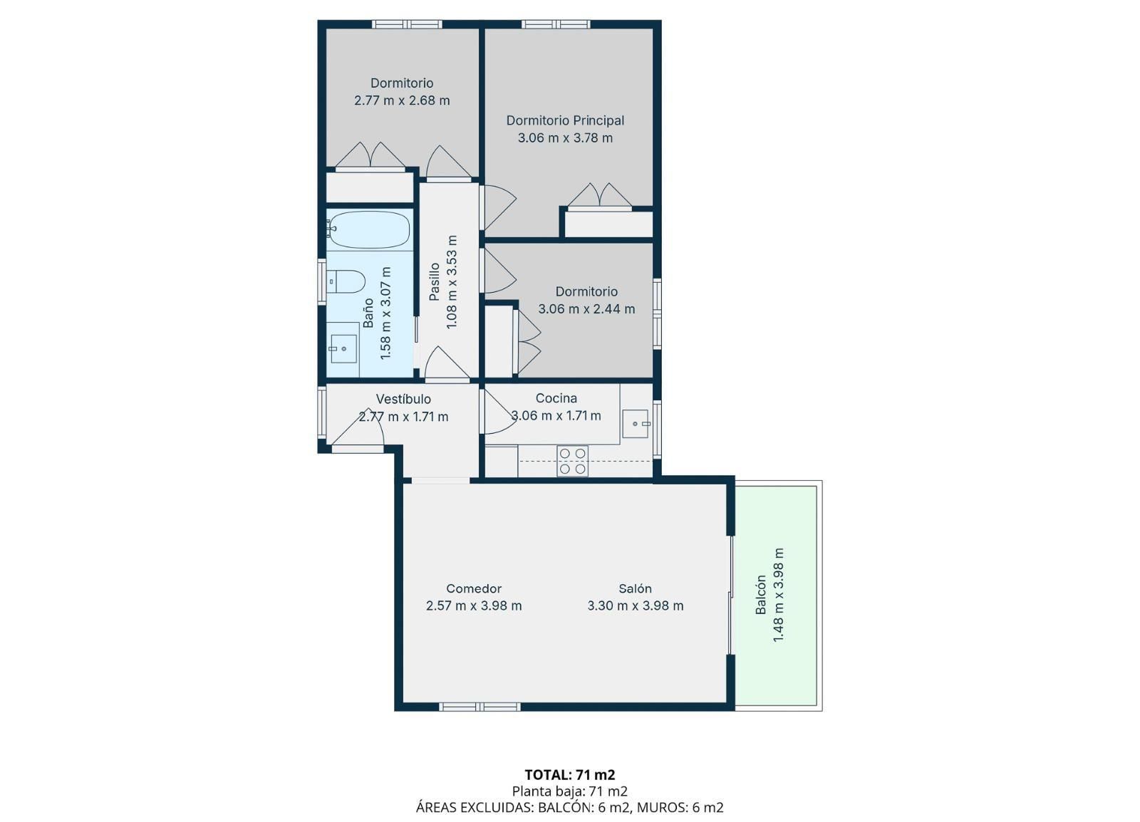 El pis es distribueix en 3 dormitoris, un bany complet, una cuina funcional i una sala d’estar lluminosa amb sortida a una agradable zona exterior. Disposa d’aire condicionat amb bomba de calor.