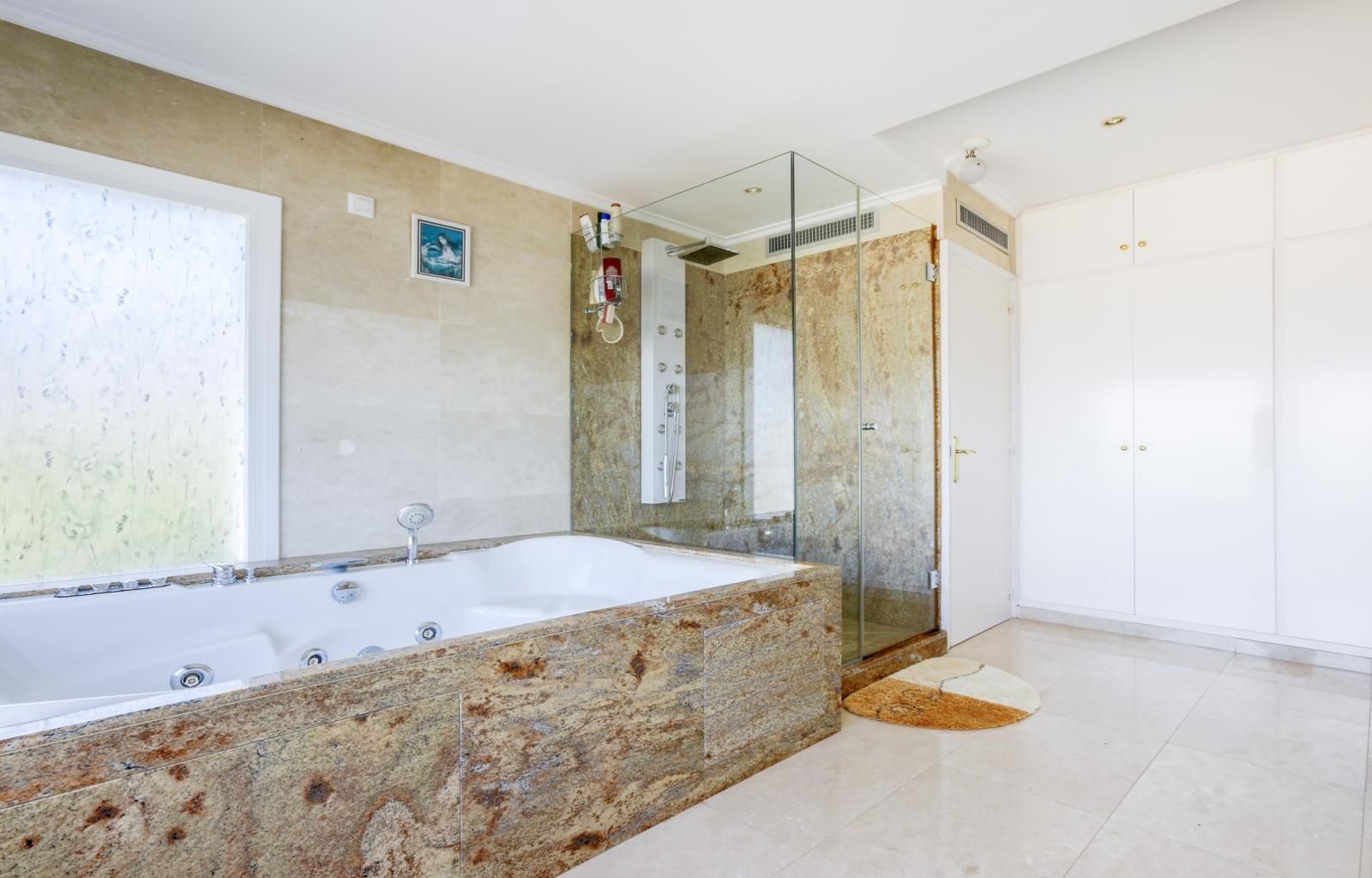 La suite principal és un autèntic refugi de pau: habitació espaiosa amb vistes al mar, vestidor independent i un bany luxós amb banyera, dutxa i acabats d’alta gamma.